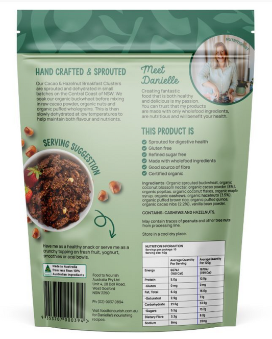 Food To Nourish Cacao & Hazelnut breakfast clusters are sprouted and dehydrated in small batches on the Central Coast of NSW.